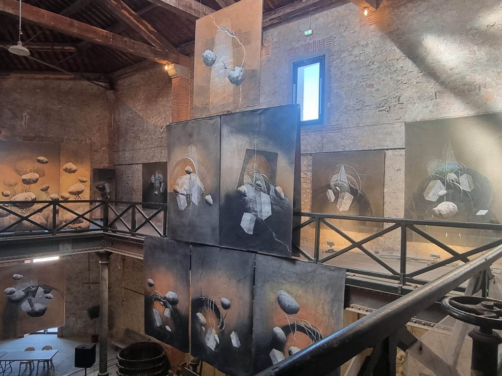 Découvrant le lieu et les œuvres, le regard se pose d’emblée sur un mur de toiles aux tons ocres ou gris sur lequel des blocs pierreux en suspension menacent. À son pied, de drôles de personnages comme des champignons, les ULF, des « singularités enfouies, des personnages souterrains qui communiquent entre eux et remontent à la surface… » nous dit le peintre. Chacun d’entre nous n’a-t-il pas sa singularité enfouie ?..