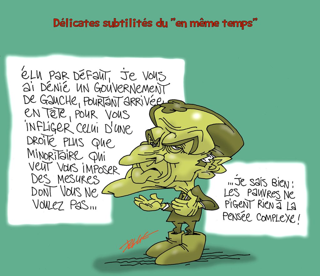 Nous avons eu, nous l’avons toujours pour notre malheur, un jeune président, ou un président jeune comme vous voulez, et il nous a mis dans le pétrin : sa plus grande réussite, la dissolution et une chambre des députés sans majorité absolue, et sa volonté forcenée de ne pas laisser le groupe le plus important la gauche s’installer au gouvernement. Comme cela se fait dans un ordre démocratique. Et garder tout pour sa pomme. L’hubris à l’état brut.