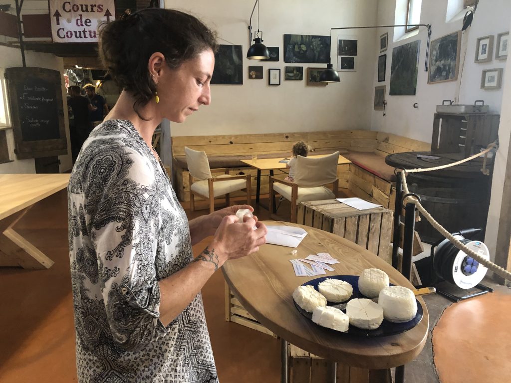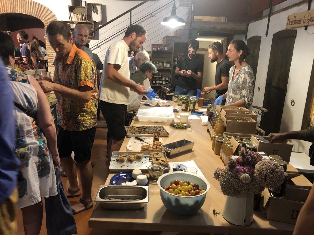 Geoffrey, brasseur, nous explique la démarche en servant sa bière (excellente) au bar : « L’épicerie paysanne s’intègre dans la fabrique de vélos Caminade, sur mesure en titane. L’idée est partie en créant un projet de cuisine, brasserie, vente de bières, en aidant les gens qui partagent nos valeurs. On héberge les producteurs locaux, on les accompagne sans prendre de marge sur les produits vendus à des prix producteurs, pour promouvoir une autre façon de consommer, en circuit court, en rencontrant les gens qui fabriquent les produits. Il y a un écosystème en place sur le territoire, des producteurs qui avaient envie d’un projet collectif, ils sont vingt aujourd’hui ! C’est un projet ambitieux, mais on reste très modestes, très prudents, il s’agit de regrouper ces énergies, en prenant appui sur les réseaux sociaux. Ce soir, c’est répétition générale pour les producteurs qui vont gérer leurs permanences, se former mutuellement, construire et faire évoluer ce projet, et pourquoi pas essaimer dans les communes environnantes ! »