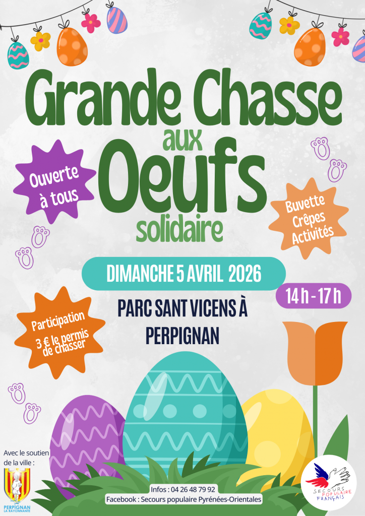 Une grande chasse aux œufs, qui aura lieu le dimanche 5 avril 2026 à partir de 14h au Parc Saint Vicens de Perpignan et une autre le lundi 6 avril de 14h à 17h dans le parc Guilhem de Cabestany. Il s’agit d’une fête populaire ouverte à toutes et à tous, petits et grands et une façon ludique de soutenir notre projet de solidarité.